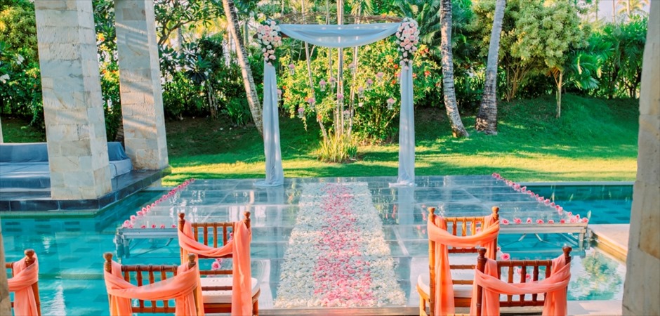 ヌサドゥアの広大な敷地の高台よりインド洋を一望できるプールサイドウェディング