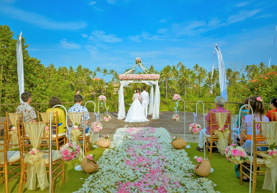 ウブドの雰囲気を感じられる景観と壮大な雰囲気に感激しました!会場はホテル内の敷地でしたが、滞在している他のお客様が通る事もなく、プライベート感があり、みんなでリラックスして過ごすことができました。入場の演出も形式にこだわらず、自由にアレンジでき良かったです。またバリニーズの子供達、パユンボーイさん達の演出があって雰囲気が出ました。コーラス隊の歌声や曲も最高で鳥肌が立ち感極まる演出でした!客室も豪華で、静かに自然を感じられる空間で非日常を味わう事ができました。可愛いルームサービスにも感動しました!ホテルスタッフの方々も親切で毎回気持ちの良い挨拶や声かけをして下さいました。
