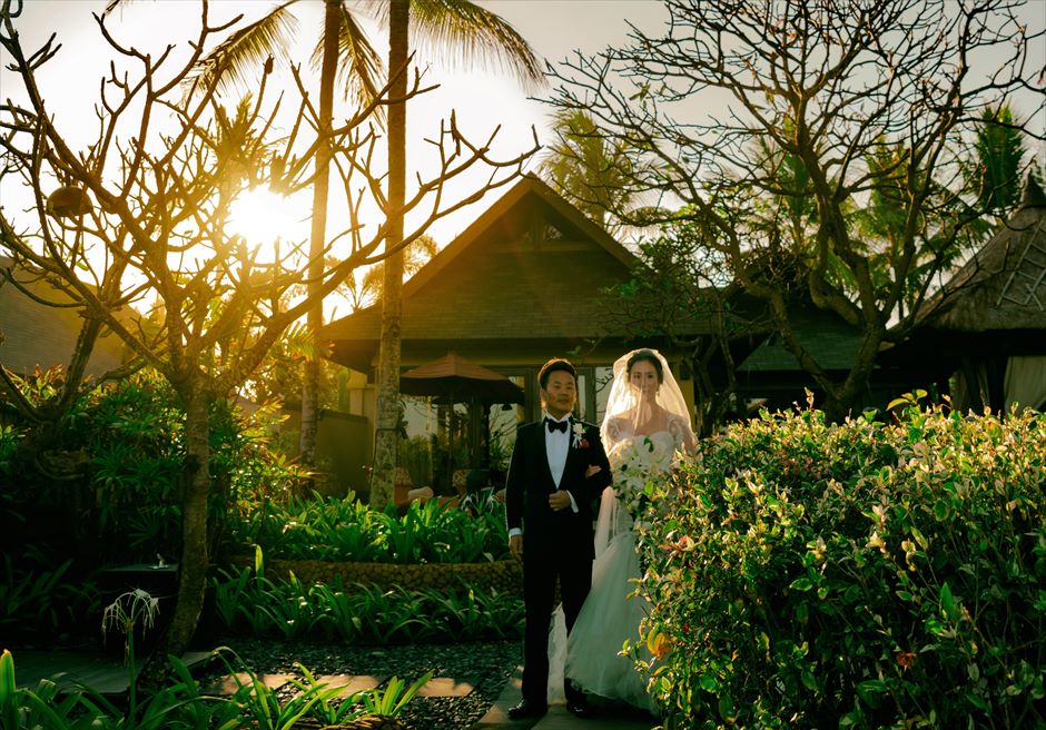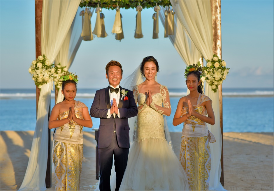 挙式は広大なヴィラから直接ビーチに入場する最高のロケーションで、全てが極上のウェディングでした。現地BLESS BALIのスタッフ、カメラマンさん、ヘアメイクさん全員が完璧なサービス・ホスピタリティ・対応でした。日本の打ち合わせから細かく、丁寧に何度もお打合せさせてもらい、挙式後の旅行のプラン・手配も完璧でした。最強の海外ウェディング会社だと思います。日本での打ち合わせでも、通常のウェディング会社のように、キャピキャピしたプランナーはいないです。BLESS BALIの日本スタッフは全員がバリ島・ウェディングに精通していて、スタイリッシュでシンプル、よいしょや不自然さはなく、ウェディングに対しひたすら多くの知識を持ち現地の事も全て即答、メールの返信は物凄く早かったです。これからもサロンのバーに遊びに行かせてもらいます。