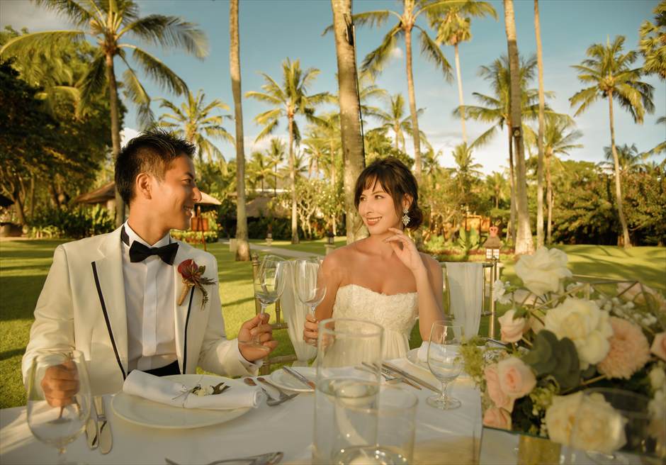 バリ島随一に広く美しいインターコンチネンタル・バリ・リゾートの白砂のビーチを一望する、緑豊かなアルン・アルン・ガーデン・ウェディング。生花をふんだんにあしらったウェディングアーチ越しに真っ青な海が広がります。挙式会場の装飾はナチュラルでラスティックで熱帯雨林が生い茂る美しいガーデンに見事に調和します。インターコンチネンタル・バリ・リゾートのウェディングは、ガーデン挙式のクオリティだけなく、挙式後の爽快なビーチやリゾート内のフォトウェディングや、夕刻には目の前に黄金の道が現れるほど美しいサンセットフォト&パーティーなど唯一無二の多彩なブライダルシーンを実現できます。