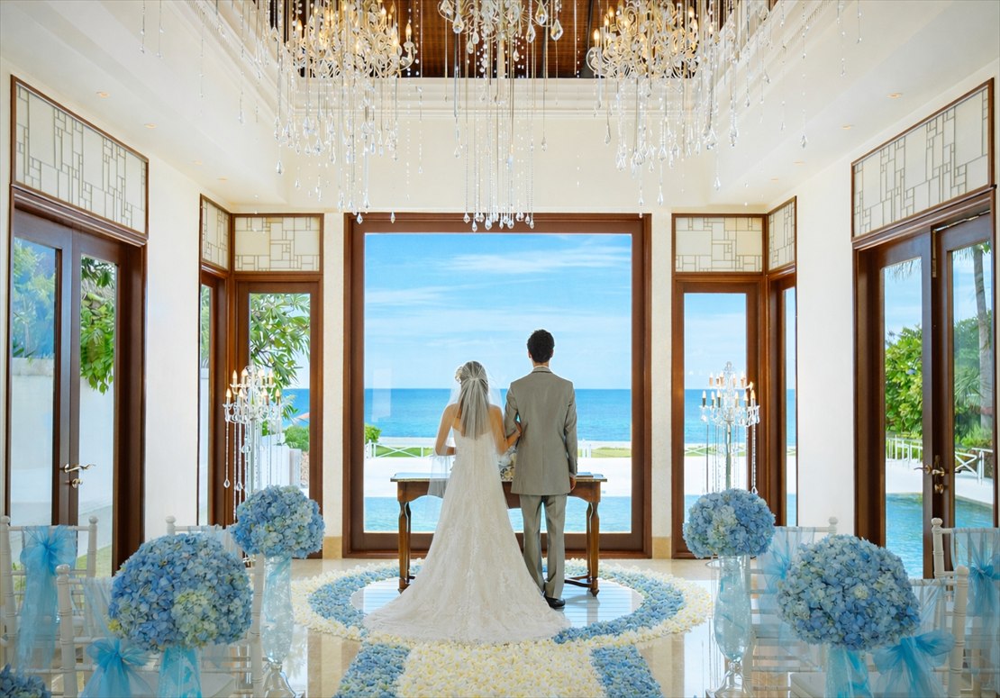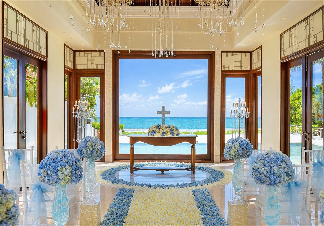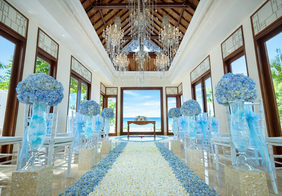 ブレス・バリのオリジナル、オールブルーの挙式会場装飾を施したセント・レジス・バリ クラウド・ナイン・チャペルのウェディングプランです。挙式会場は目の前の真っ青な海と空に溶け込むように、ブルーの紫陽花とホワイトのプルメイアをメインにラジュジュアリー且つ明るく仕上げました。バージンロードと祭壇周りには沢山の紫陽花とプルメリアを敷き詰め、アイルサイドには6つの紫陽花のスタンディングフラワーを豪華に配しております。祭壇のセンターピースフラワーには紫陽花とホワイトローズを使用し、目の前に広がるビーチの海と砂浜のブルーとホワイトとベストマッチングさせました。セレモニーチェアの装飾は、ブルー・ピンク・ホワイト・ゴールドからお選びいただけます。隣接する支度部屋からチャペルを越えビーチまでシーブリーズが吹き抜ける、バリ島で最も爽やかなビーチフロント・チャペルウェディングです。