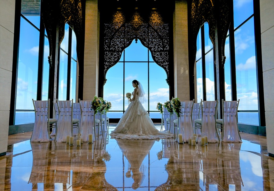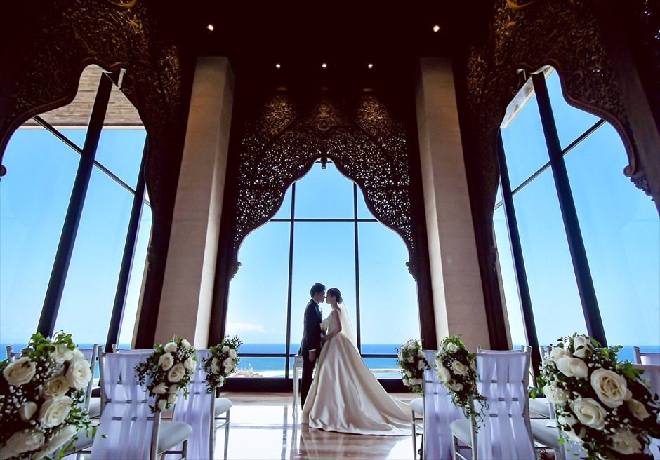 ジ・アプルヴァ・ケンピンスキ・バリ オーシャンビュー・クリフ・チャペルに生花のフラワー・アーチの装飾を施したウェディング・プラン。生花のホワイトローズとアカシアリーフのウェディングアーチは、クリフ・チャペルの神秘的な形状にあわせてご挙式日、お二人だけのために制作されます。チャペルへの幻想的なロビーからの回廊に続くようアイルサイドは生花のパールアスターで埋め尽くされ、祭壇の生花センターピースは眼下に望む真っ青な空と海に溶け込みます。