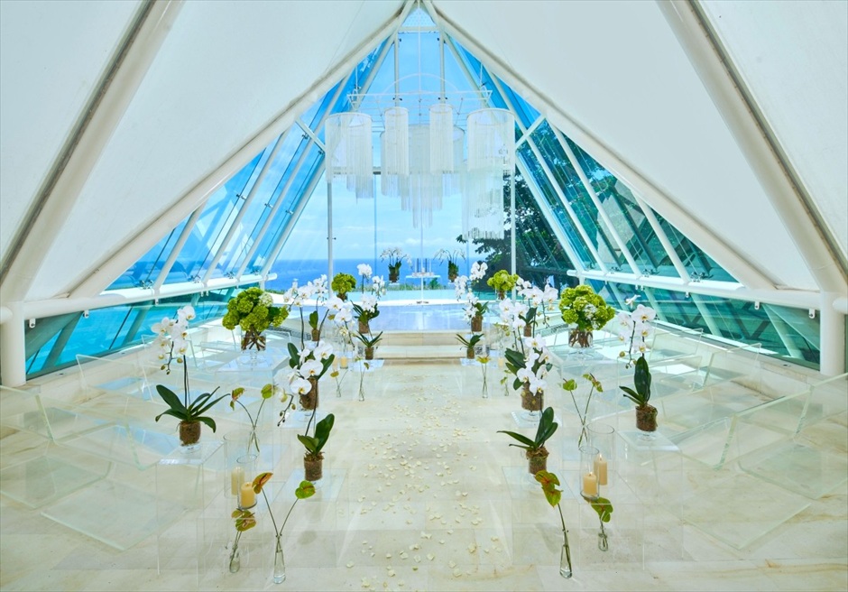 ティルタ・ウルワツのチャペル内の新装飾プラン。グラスや生花を使用したナチュラルな挙式会場装飾です。