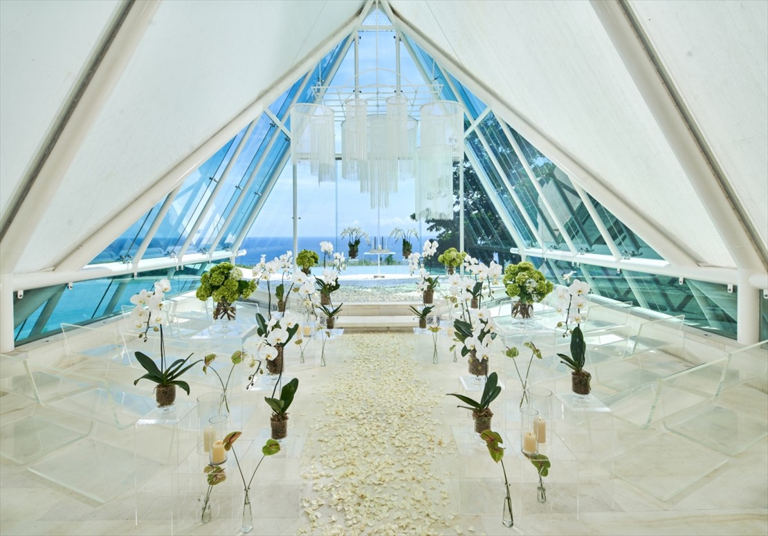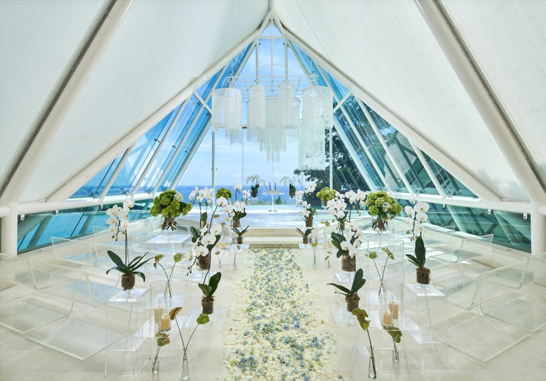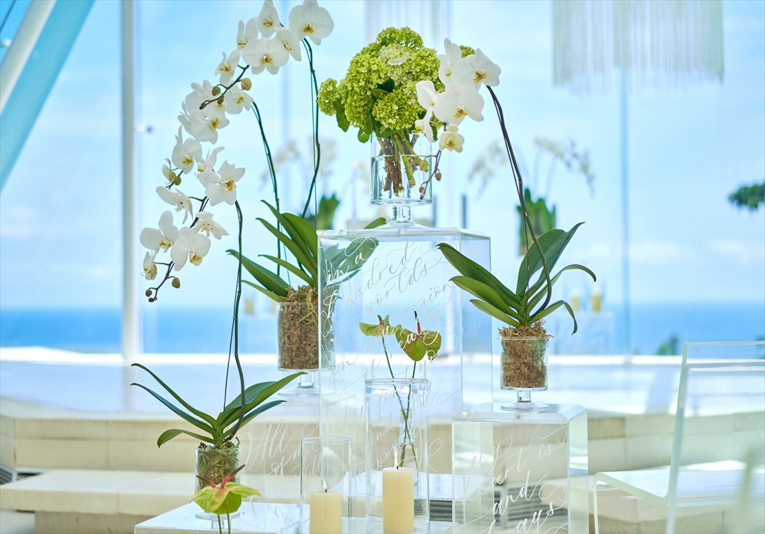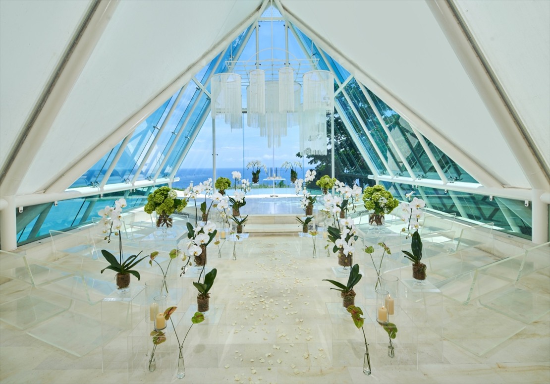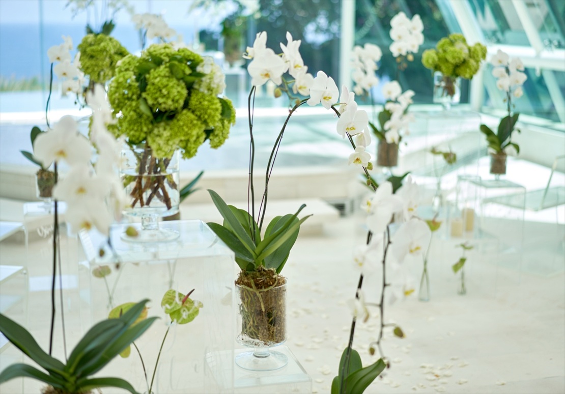 ティルタ・ウルワツのチャペル内の新装飾プラン。グラスや生花を使用したナチュラルな挙式会場装飾です。